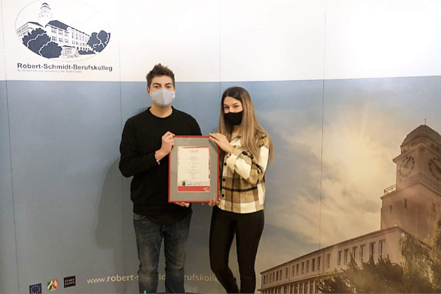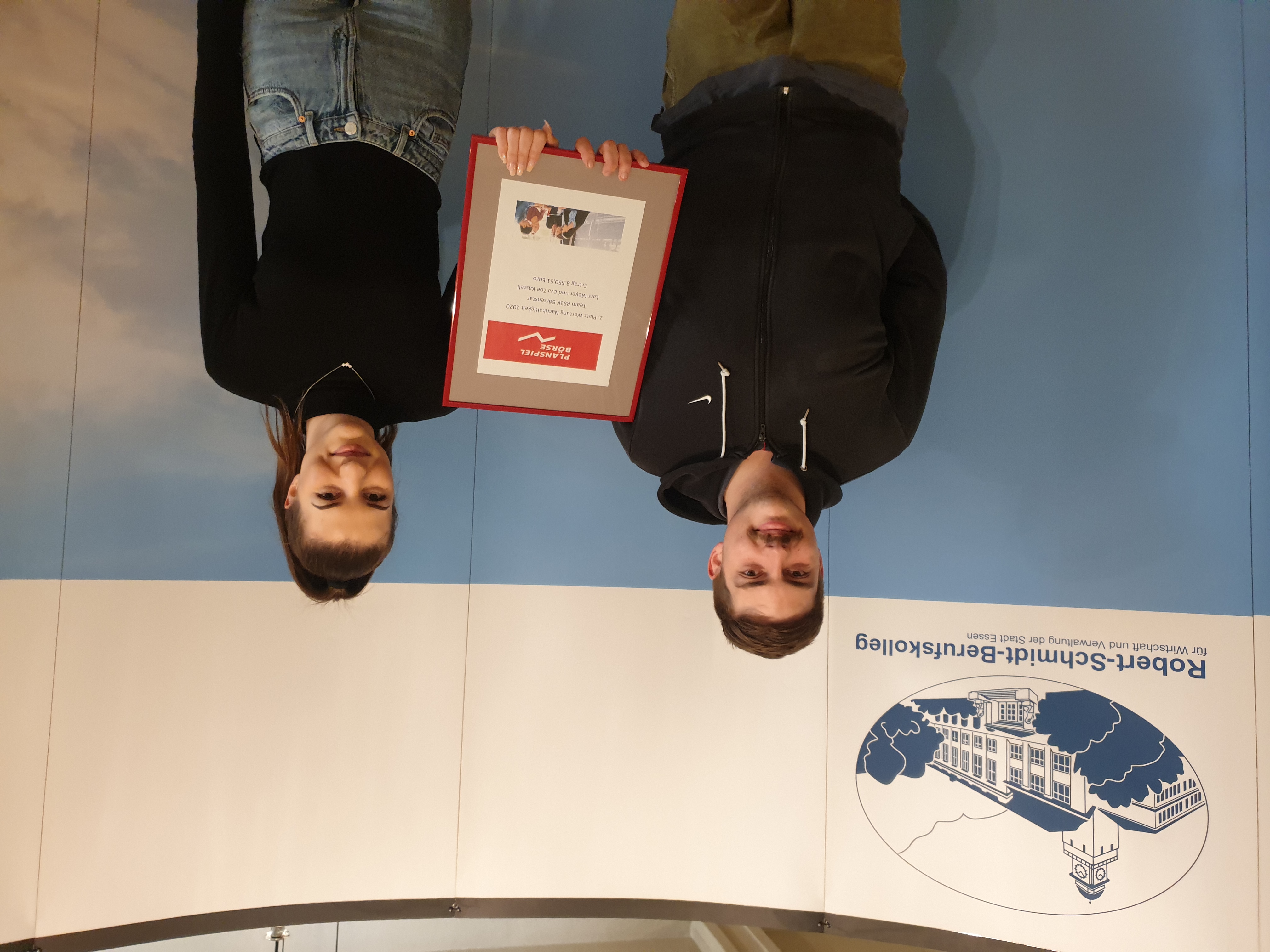 Lars Meyer und Ibtissam Boutanach haben beim Planspiel Börse 2021, unter Anleitung des Fachlehrers Herrn Klein, den 1. Platz in der Wertung Nachhaltigkeit der Sparkasse Essen belegt. In der Auswahl waren nur Aktien, die nachweislich nachhaltig wirtschaften und ihren Beitrag zur Umwelt leisten.