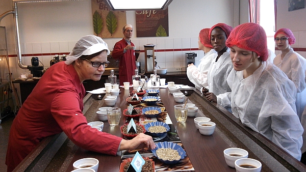Höhepunkt der Betriebsbesichtigung war eine Verkostung unterschiedlicher Kaffeesorten durch die Auszubildenden. Hier sollten die Teilnehmer ihre Geruchs- und Geschmackssinne nutzen, um Körper, Fülle, Säure und Nebennoten zu unterscheiden, was einigen Probanden sogar erstaunlich gut gelang. Insgesamt hat die Betriebsbesichtigung den angehenden Großhandelskaufleuten ausgesprochen gut gefallen, was auch an der überaus herzlichen Aufnahme durch die Mitarbeiter der Schirmer-Kaffee GmbH lag.