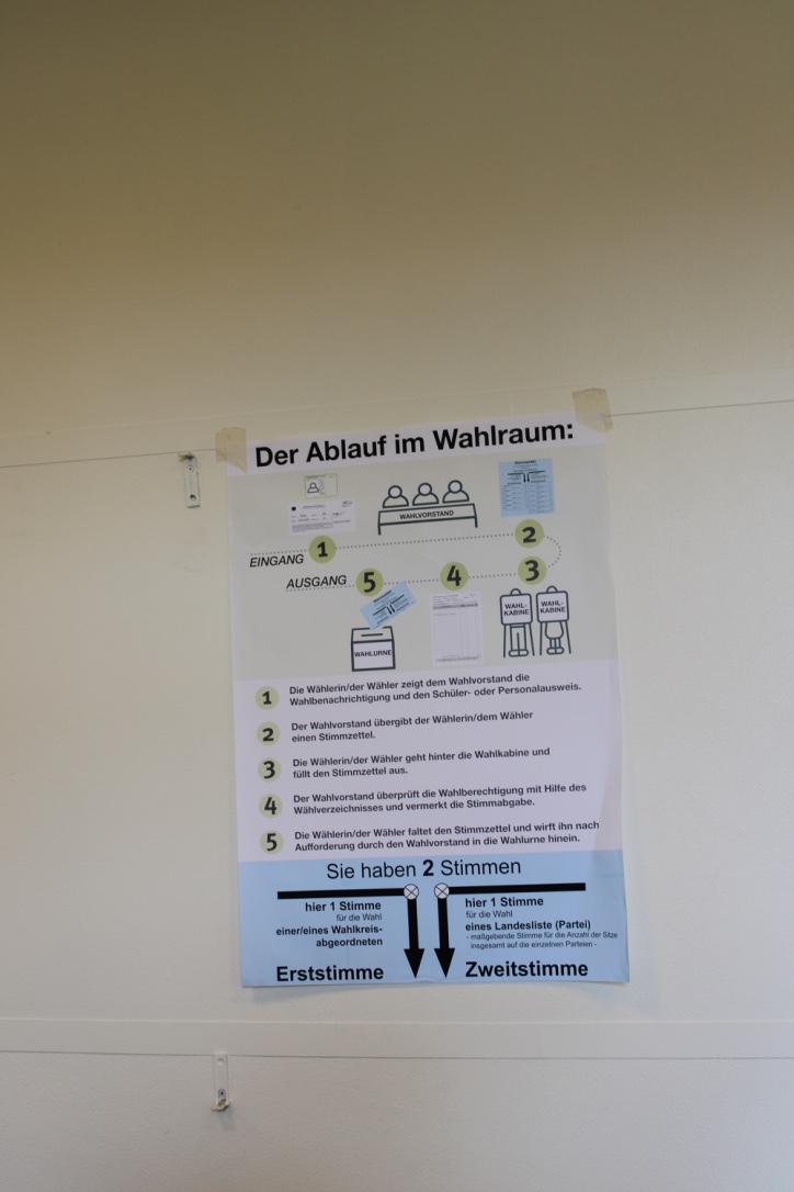 Die Juniorwahl ermöglichte allen Schülerinnen und Schülern, gleich welchen Alters oder Nationalität, die Abgabe ihrer Erst- und Zweitstimme auf Stimmzetteln des Wahlbezirks Essen II in einem mit Wahlkabinen und Wahlurne eingerichteten Wahllokal. Den Wahlvorstand bildeten dabei jeweils 3 Schülerinnen und Schüler jeder Klasse, die sehr ernsthaft und unter den wachsamen Augen ihrer Lehrerinnen und Lehrer ihre Mitschülerinnen und –schüler zur Wahl anleiteten: „Wahlbenachrichtigung vorzeigen und Stimmzettel in Empfang nehmen, Erst- und Zweitstimme in der Wahlkabine ankreuzen und anschließend nach der Verifizierung in eine versiegelte Wahlurne einwerfen“.