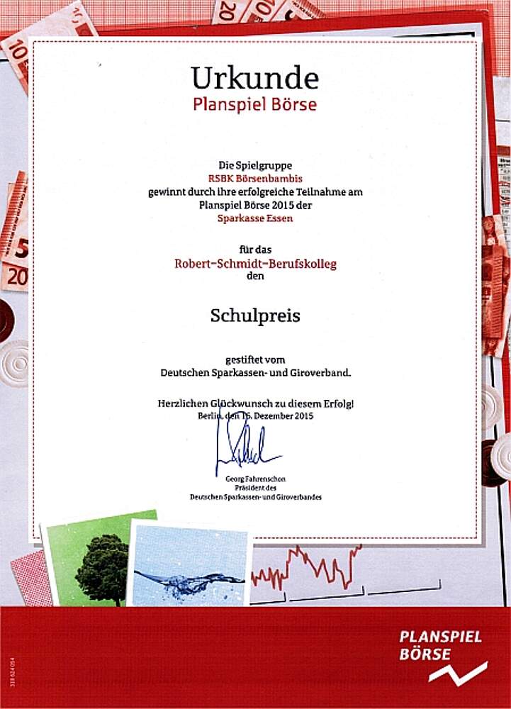 In diesem Jahr konnte das Robert-Schmidt Berufskolleg aus Essen-Bergerhausen einen historischen Erfolg für sich verbuchen. Die Schule hat daher die Hürden für die deutsche Fußballnationalmannschaft bei der Heim EM hochgelegt. Beim Börsenspiel der Sparkassen in Europa treten Schülerteams aus allen Ländern gegeneinander an. Ziel ist es dabei 50000 virtuelle Euro über eine App in Wertpapiere, wie Aktien, Anleihen, Fonds und weitere Finanzprodukte in einen Zeitraum von vier Monaten anzulegen. Das Team mit dem höchsten Ertrag im Zeitraum von Oktober bis Januar wird dann zum Sieger gekürt. Die Spielrunden auf Schul-, Stadt-, Landes-, Bundes-, und Europaebene werden einzeln gewertet. Die Schüler Lena Fiedler und Pierre Reiche und der betreuende Lehrer Lutz Klein aus der Höheren Handelsschule siegten auf allen Ebenen. Sie können sich neben dem Titel Europameister auch über den nationalen Titel „Deutscher Meister“ freuen. Im Rahmen der Deutschlandwertung belegte die Schule die Plätze 1, 3 und 5 in der Wertung Nachhaltigkeit von 38000 teilnehmenden Teams. Die Betreuung der Teams und die Reiseleitung erfolgte durch Frau Bettina Hölker-Griess von der Sparkasse Essen.