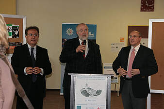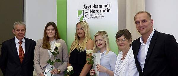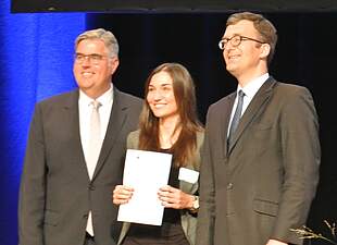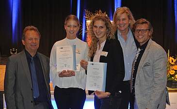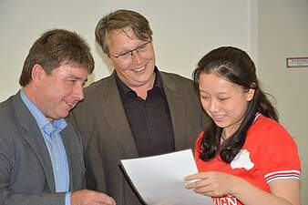 Unsere Schülerinnen erhielten eine Urkunde und wurden fotografiert mit dem IHK-Präsidenten Dirk Grünewald (rechts) und dem IHK-Hauptgeschäftsführer Dr. Gerald Püchel (links).