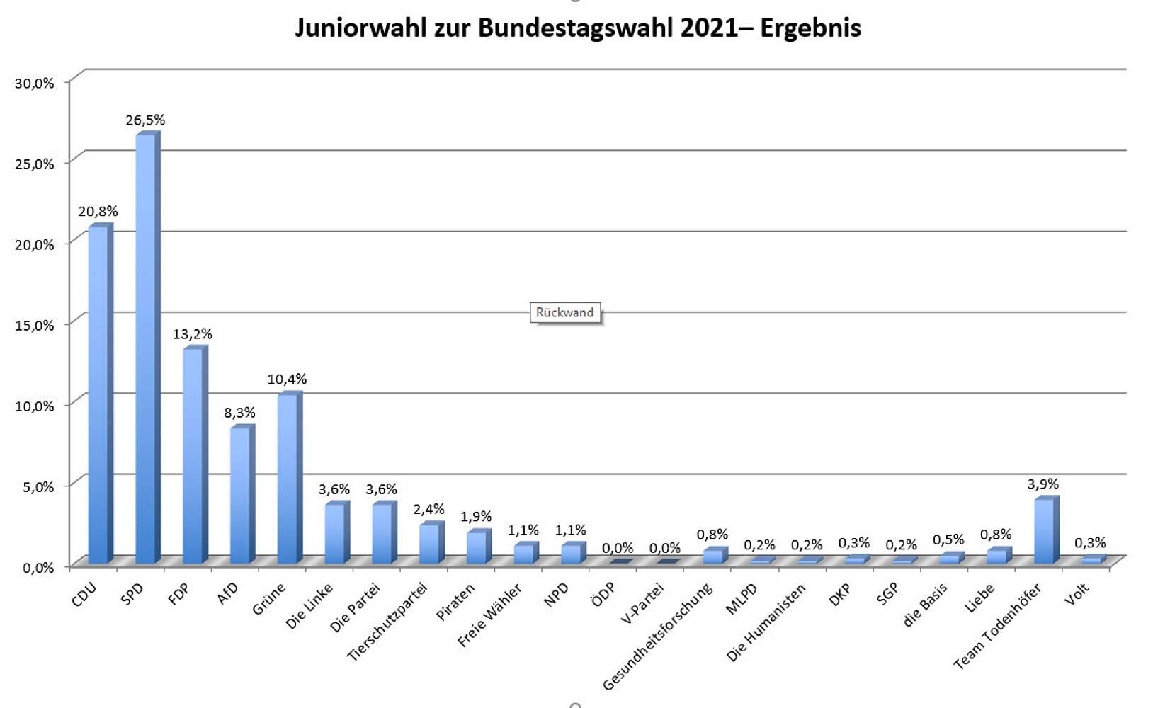 Die Wahlzettel wurden am Freitag vor der Bundestagswahl von einem Lehrendenteam ausgezählt und an die Juniorwahlzentrale übermittelt. Die Wahl an unserer Schule führte zu folgenden Ergebnissen und bildet damit die Ergebnisse der „richtigen“ Bundestagswahl erstaunlich genau ab: SPD 26,5 %, CDU 20,8 %, FDP 13,2 %, Grüne 10,4%, AfD 8,3 %, Linke 3,6 %.