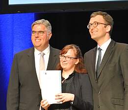 Da Andre Reineke das Traumergebnis von 100 Punkten erreicht hatte, wurde er sogar noch zu einer dritten Bestenehrung eingeladen: Als bester Auszubildender in seinem Beruf in Deutschland nahm er an der Nationalen Bestenehrung 2015 am 14. Dezember 2015 im Maritim Hotel Berlin teil. Damit setzte er eine gute Tradition unseres Berufskollegs fort, denn bei dieser Ehrung in Berlin waren Absolventen unserer Schule in der Vergangenheit bereits mehrfach vertreten - unter anderen auch bei der ersten Veranstaltung vor 10 Jahren, als die damals gerade frisch gewählte Bundeskanzlerin Angela Merkel eine Großhandelskauffrau aus unserem Hause auszeichnen konnte.